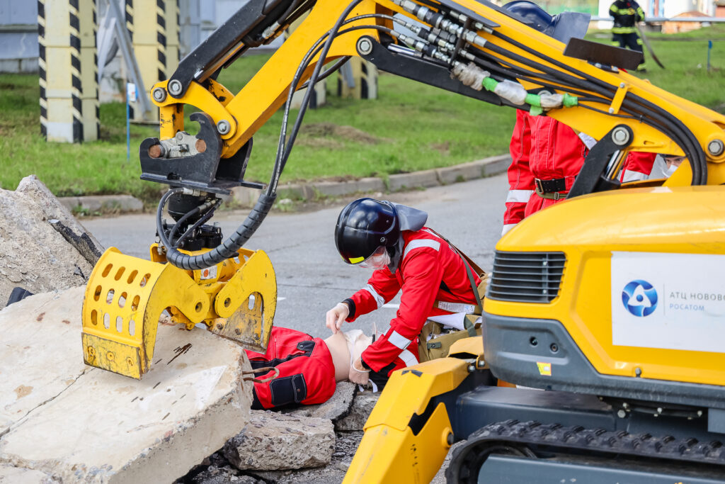 Циклон не утихает. На площадке с реакторами РБМК обрушивается кабельная эстакада. По технологической схеме оба энергоблока в этом случае переводят на резервное электропитание. Через проходную на территорию Ленинградской АЭС спешат специалисты группы оказания экстренной помощи атомным станциям «Росэнергоатома» и спасатели нештатных формирований гражданской обороны — ​сотрудники АЭС, прошедшие специальное обучение. Колесно-шагающий мини-манипулятор «Торнадо» выполняет первичную гамма-съемку на месте обрушения эстакады: радиационный фон в норме. Дозиметрист подтверждает, что превышения нет, и спасатели с роботом-разрушителем Brokk начинают разбор завалов. «Стоп!» — ​звучит команда из мобильного пункта управления Аварийно-технического центра «Росатома». Под завалами человек! Его роль играет станционный манекен Миша. Спасатели бережно достают Мишу из-под обломков опор и переносят в скорую.