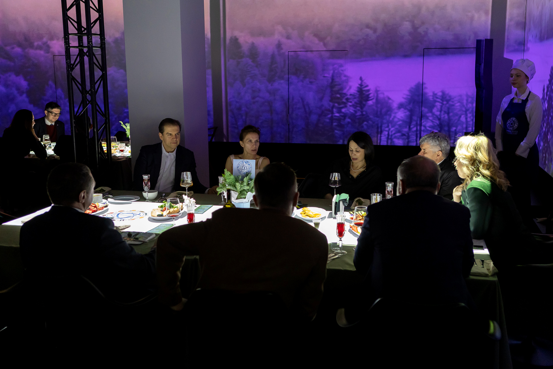 Погружению в атмосферу способствовал спектакль, разворачивающийся прямо между столами, а также иммерсивные экраны с историей атомной промышленности и рассказом о гастрономии атомных городов.