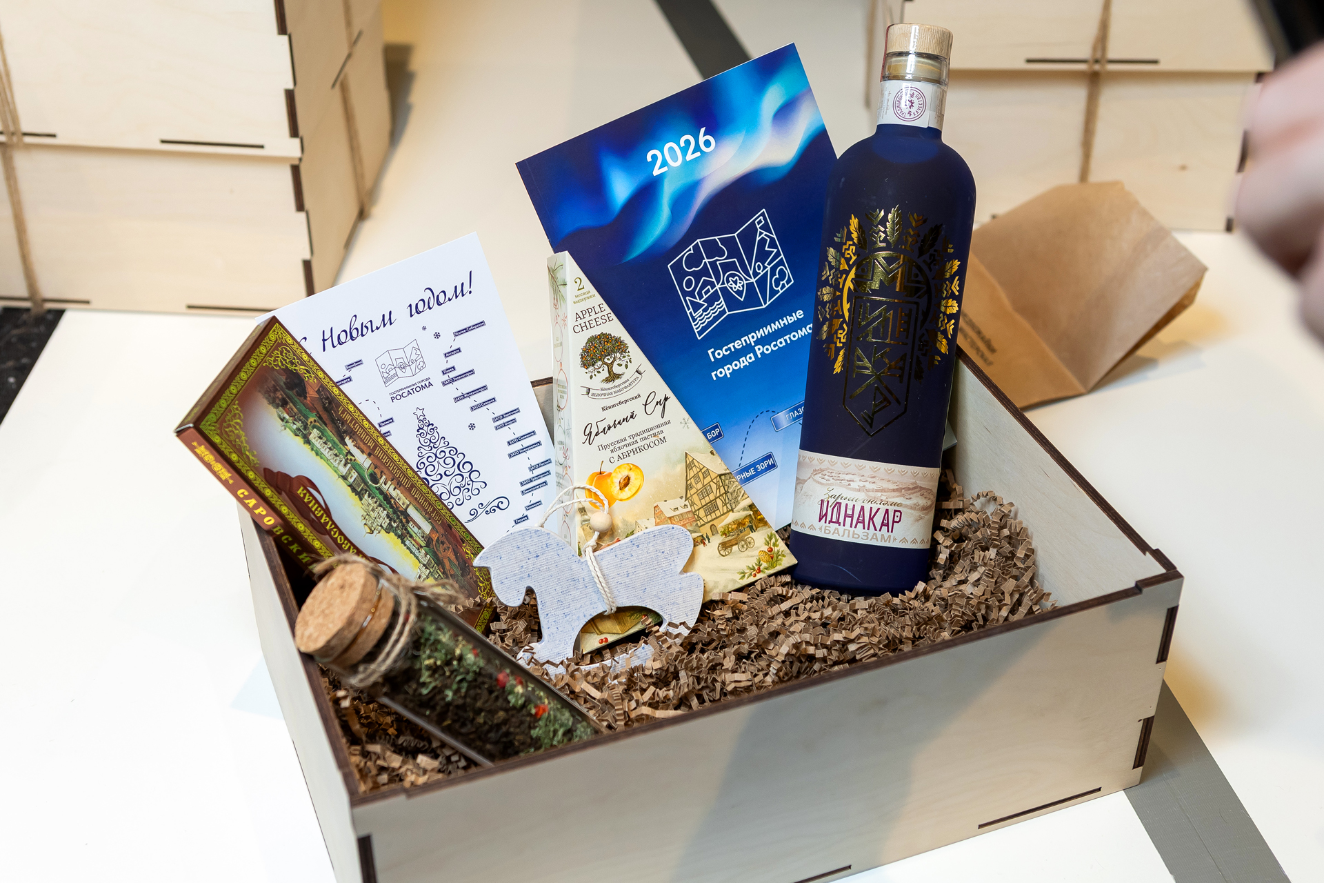 В преддверии Нового года организаторы не могли оставить гостей без подарков. Участникам вручили бандероли с сувенирами из атомных городов: арктический чай из Полярных Зорь, яблочный сыр из Немана, шоколад из Сарова, бальзам из Глазова и символ года, лошадка, из Соснового Бора.
