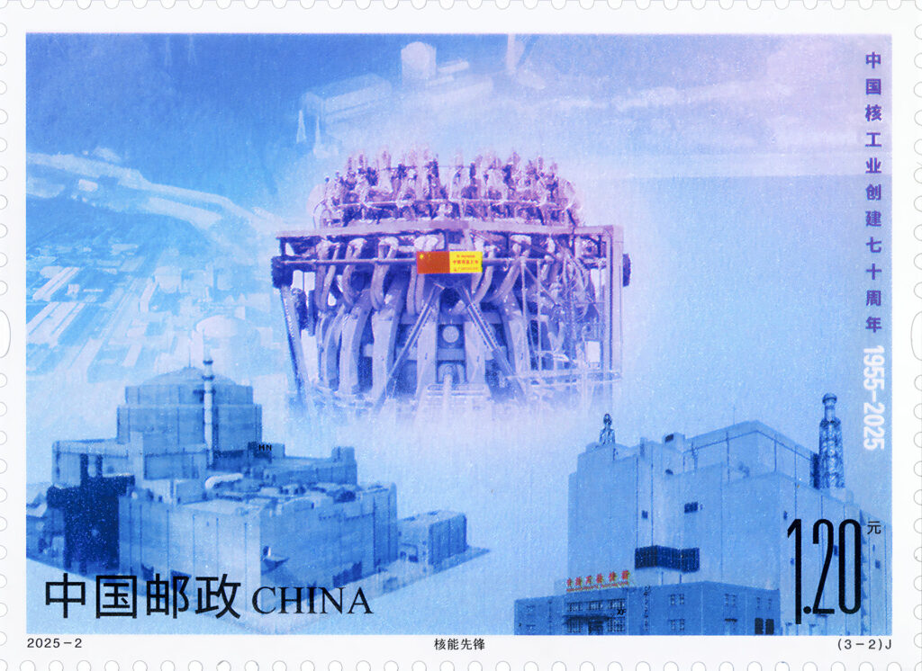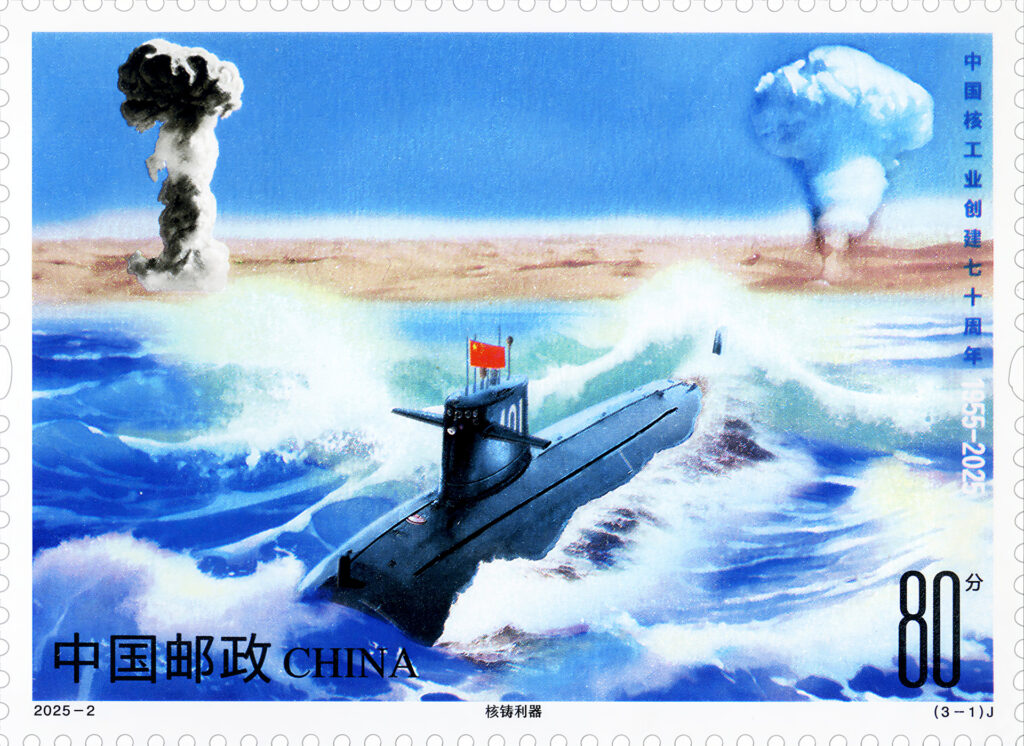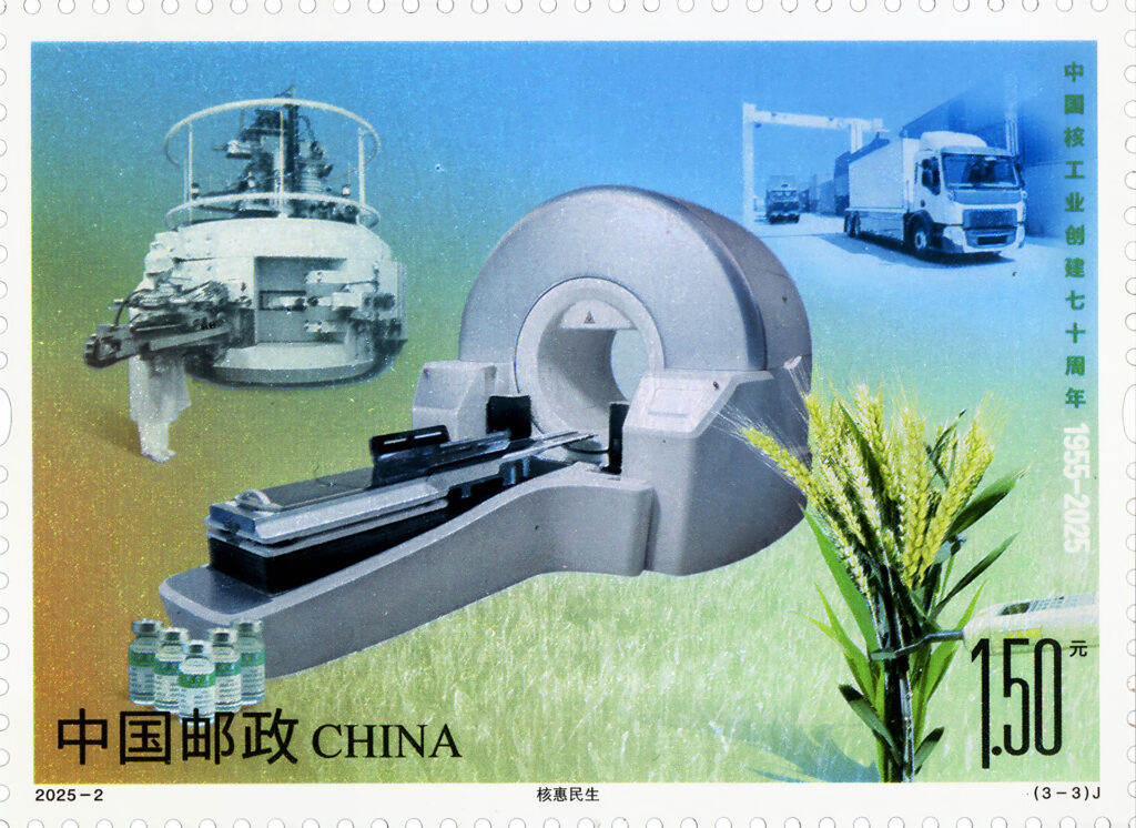 К 70‑летию атомной промышленности в Китае выпустили три марки. На одной изображена атомная подводная лодка, на второй — Циньшаньская АЭС, на третьей — гамма-нож, радиофармпрепараты, ускоритель, средства дозиметрии и досмотра. Это отражает применение ядерной энергии в медицине, безопасности, сельском хозяйстве и других областях.