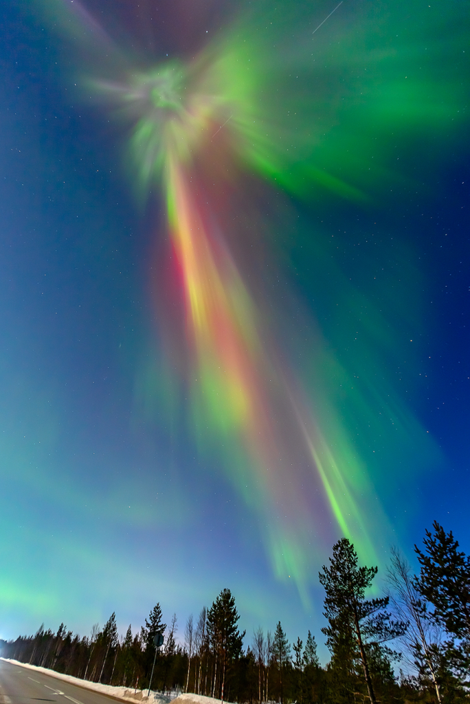 В этом году фотограф сделал немало работ. Наиболее удачной считает «Снежного дракона», снятого еще в январе 2025 года. Зашел подальше в лес, чтобы не мешали городские огни, выбрал выразительное заснеженное дерево, подобрал удачный ракурс. Сияния ждал около восьми часов на 30‑градусном морозе. Согревался горячим чаем, термос всегда при нем. Результатом остался доволен.