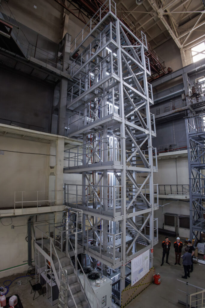 В институте построили экспериментальную установку расчетной производительностью до 5 кг азота‑15 в год. Научно-исследовательские и опытно-конструкторские работы профинансировали в рамках Единого отраслевого тематического плана. Высота колонн, в которых происходит разделение изотопов, — 25 м.