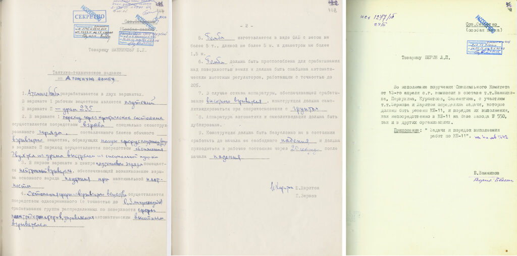 - 9 апреля 1946 года — Совет Министров постановил создать конструкторское бюро (КБ‑11) при Лаборатории № 2 АН СССР. Начальником назначен Павел Зернов, главным конструктором — Юлий Харитон. Одним из ключевых принципов работы коллектива был девиз Харитона «Мы должны знать в 10 раз больше, чем нам нужно сейчас».