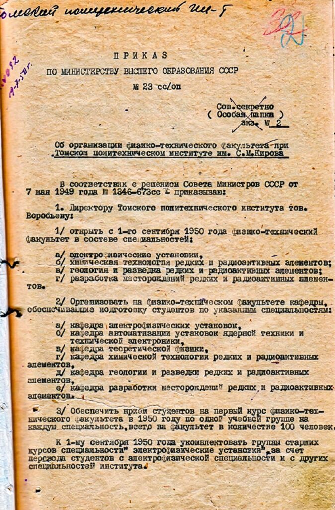 Приказом Министерства высшего образования СССР открыт физико-технический факультет. Две его основные задачи — подготовка кадров и участие в научно-технических разработках атомной отрасли.
